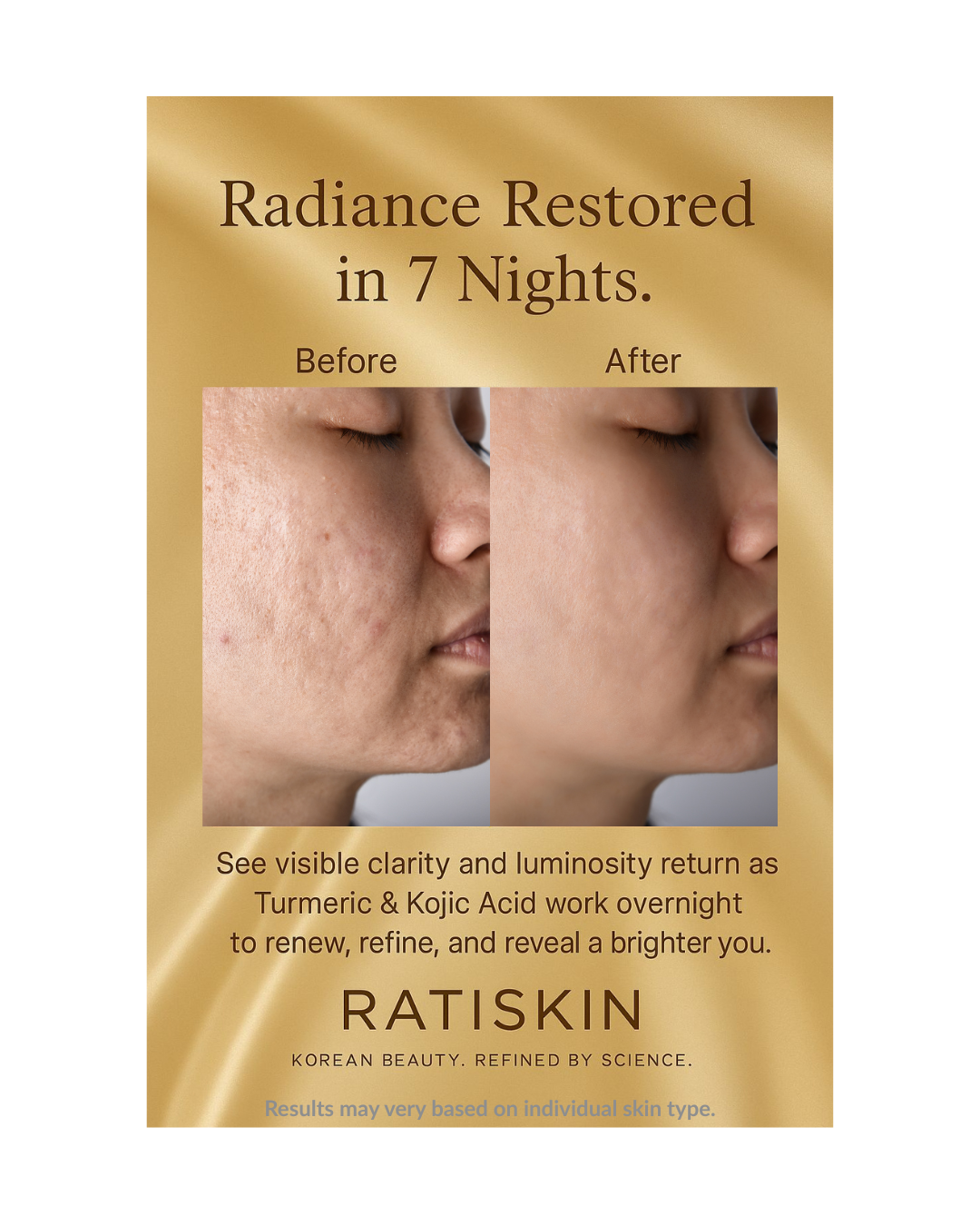 Deep nighttime repair – While you rest, turmeric and kojic acid work together to fade dark spots, calm redness, and restore a balanced complexion.